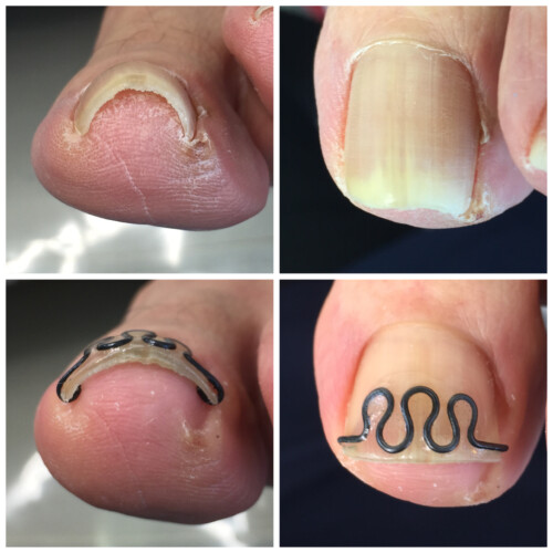 施術の流れとしては、まずお湯に足をつけて爪を柔らかくし、特許取得済みのリフターで爪を持ち上げます(予備矯正)。その後、個々の爪の形に合わせた装具を装着します。
