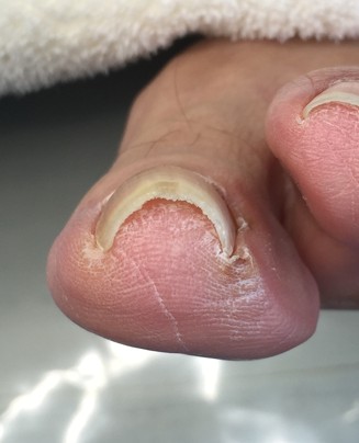 最初は「少し違和感があるかな?」程度だったそうですが、徐々に爪のカーブが強くなり、ついには**「靴を履いて歩くとズキズキ痛む」**状態になってしまいました。