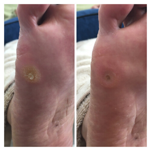 拝見すると靴による強い圧迫で皮膚の奥深くまでウオノメの芯が入り込み、神経を刺激している状態でした。